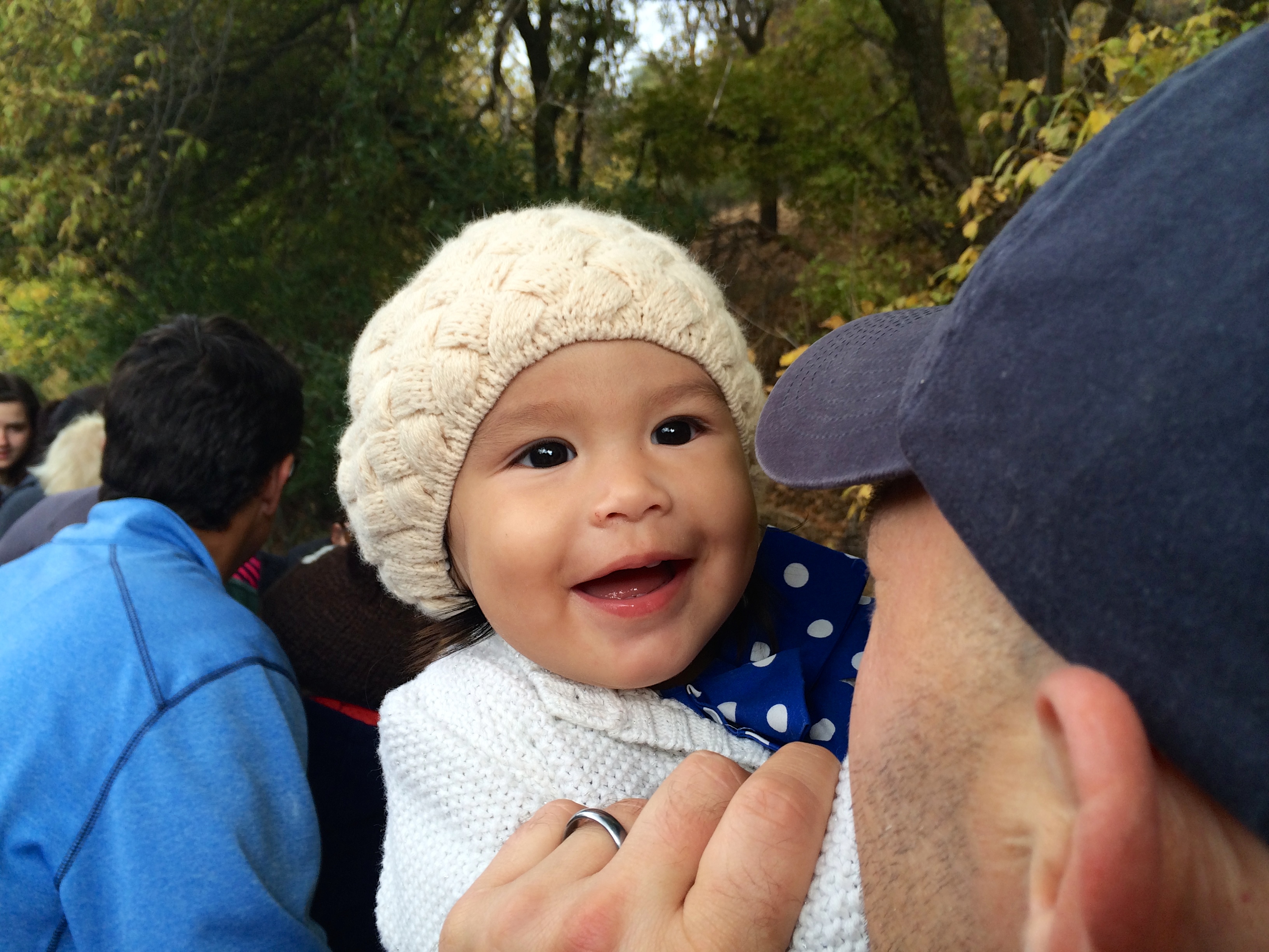 She growls at every animal she sees. And calls everything round or circular a ball. She says “hi” in a very high pitched tone and says “hi daddy!” and “hi there” and she’s tries to say “hi kho” (Chloe). She loves animals and gets excited to pet them. She says “more” when she wants to eat more of something. She will give me or daddy kisses when we ask for them. She takes my cell phone and puts it to her ear and starts to babble away as if she’s carrying a conversation that no one else can understand. She’s waves bye bye. And the latest new thing, she plays the flute. So cute!