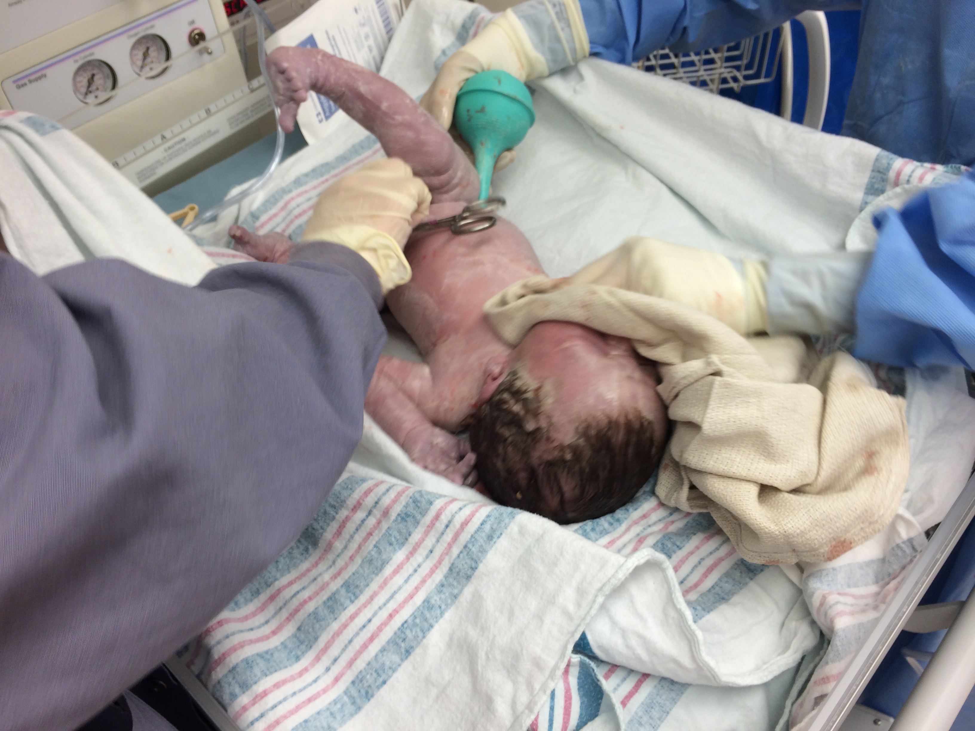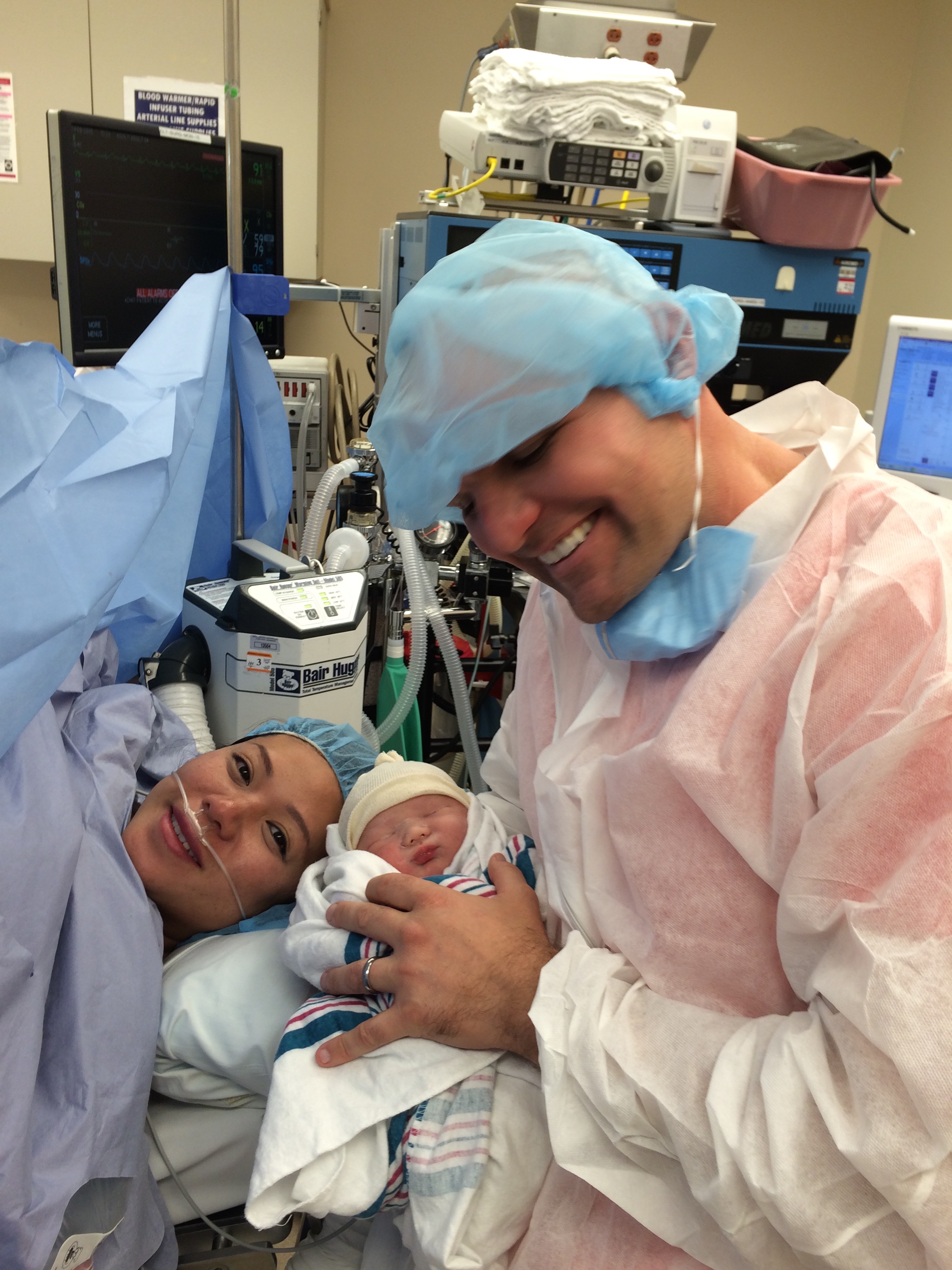 The anesthesiologist, Dr. Wapner was fantastic. He listened to my concerns about being nauseous and really kept me from throwing up. The scariest part of the ordeal was the initial spinal block. Whatever medication he used I felt instantaneous and my legs immediately felt heavy and I felt so drowsy as I was laying down, almost like I was slowly passing out but desperately trying to hang on. I was diaphoretic and scared that I was slipping. And he came to me and asked me what my normal heart rate was and I told him 90s and he said right now my heart rate was in the 40s, so he worked on bringing that back up. Chris came in and sat next to me head and rubbed on my head trying to comfort me cause he knew I wasn’t feeling well based on how I looked. But Dr Wapner reversed it all, and I started to feel better. They had already started working on cutting me open and I liked hearing the conversations around me because it let me know I was still a live and still a part of this world. Pretty soon they had him out and the first thing Chris said was, “Does he have hair??” I haven’t asked him about it, but I thought that was a funny first thought. My first words were, “he’s still a boy??”